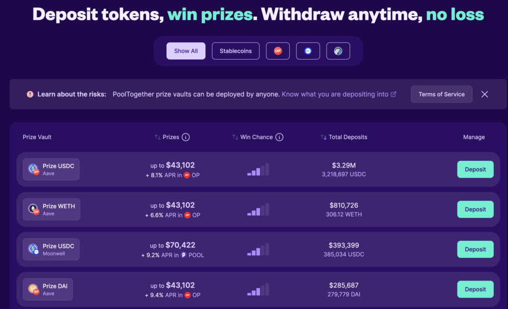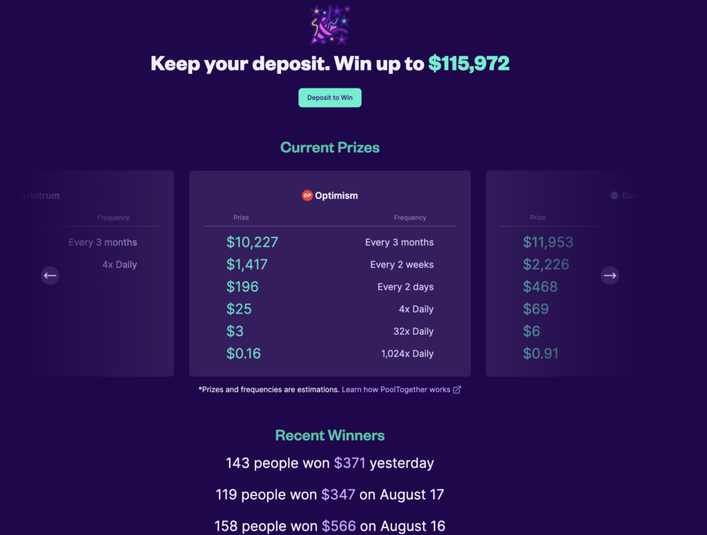PoolTogether is perfect for anyone who enjoys the thrill of a lottery but hates the idea of losing money. It’s a great way to be part of a growing community of smart savers and have a chance to win exciting prizes every week.